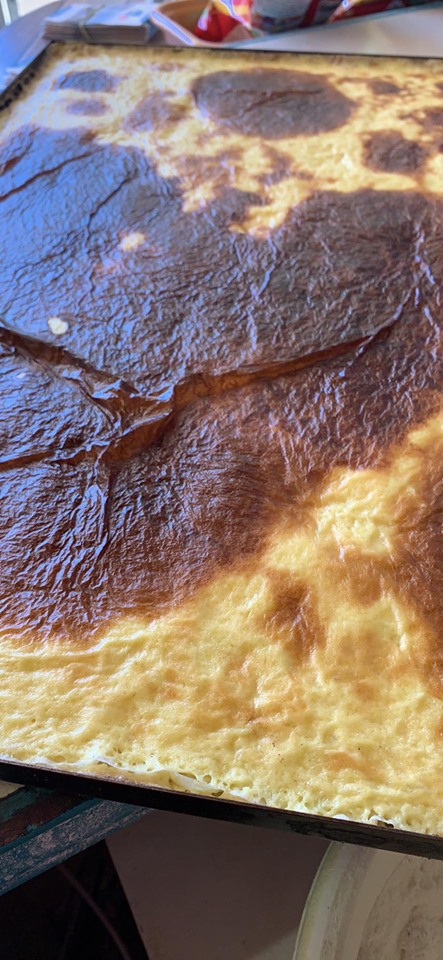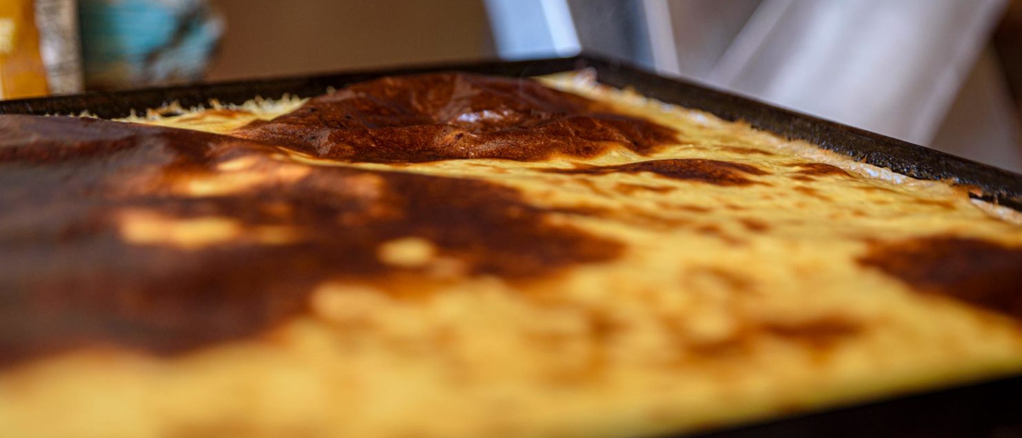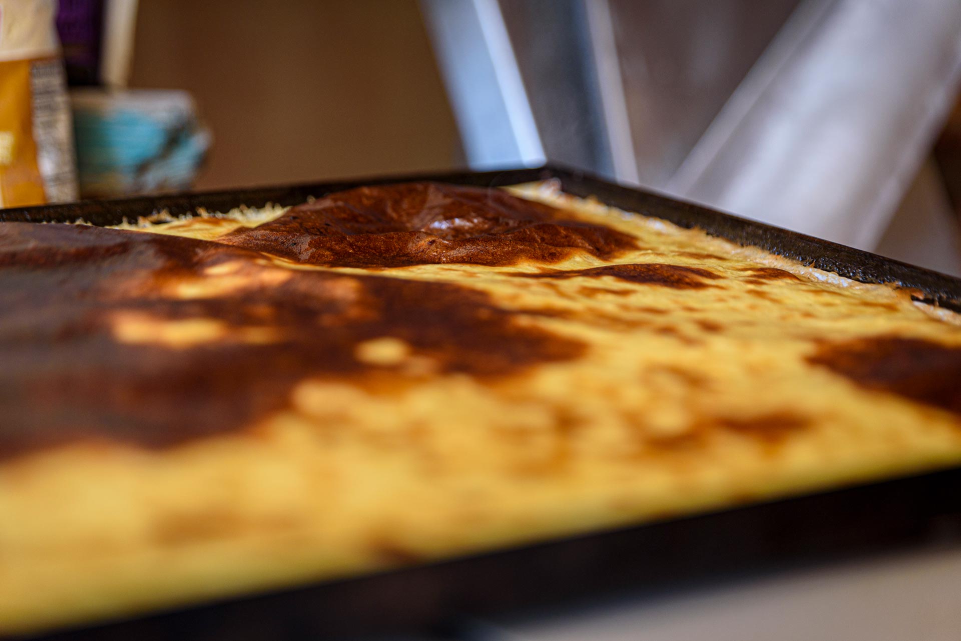 La Cade, elle, est cuite directement au four dans sa forme de pâte encore liquide, sans friture, ce qui lui donne cette légèreté relative et ce moelleux caractéristique. Même famille, autre caractère.  Gillou la fait moelleuse au milieu, un peu plus dorée sur l’extérieur. Si vous achetez une part, vous pouvez même choisir la partie de la plaque de cade qui vous fait le plus plaisir. Certain.es aiment plutôt le fondant du milieu, d’autres préfèrent les bordures plus en dentelles et parfois plus croustillantes avec l’huile d’olive qui a un peu frit les bords.